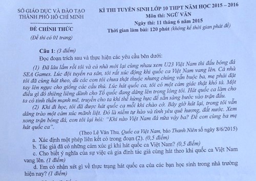 Đề thi Ngữ văn vào lớp 10 tại TP HCM gồm 3 câu hỏi. Ngay khi nhận đề, nhiều học sinh thấy thú vị khi câu hỏi đầu tiên nhắc đến đội tuyển U23 Việt Nam đang thi đấu tại SEA Games 28, diễn ra ở Singapore.