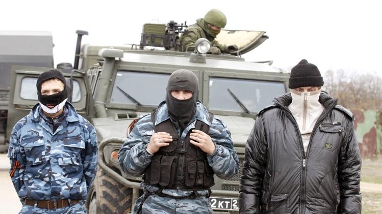 | Nhóm lính vũ trang không mang phù hiệu chặn đường tới một sân bay tại thành phố Sevastopol, bán đảo Crimea hôm 28/2. Hãng thông tấn Interfax dẫn lời Bộ Quốc phòng Ukraina và một sĩ quan tại căn cứ quân sự Ukraina ở thành phố Sevastopol, bán đảo Crimea cho hay, khoảng 100 lính Nga bao vây căn cứ hôm 7/3. Ảnh: AP |
