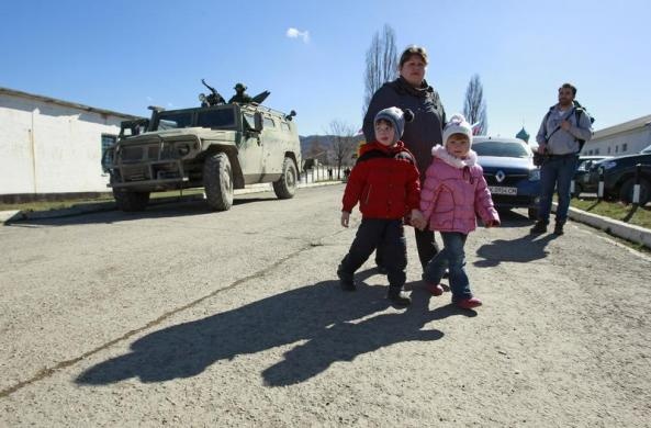 Sự hiện diện của những người lính mặc quân phục xanh đã gây chia rẽ trong cộng đồng dân cư ở nhiều nơi tại Crimea. Ảnh: Reuters.