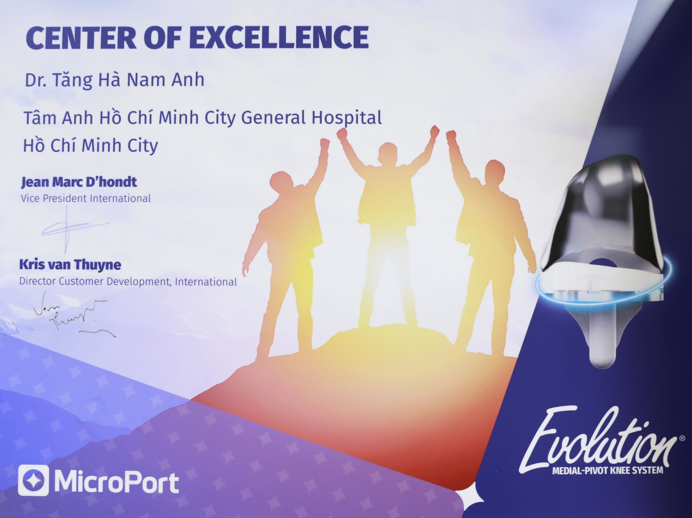 Tổ chức đào tạo y khoa quốc tế MicroPort đã cấp chứng nhận Center of Excellent cho TS.BS Tăng Hà Nam Anh và Trung tâm Chấn thương Chỉnh hình - Hệ thống BVĐK Tâm Anh. Với chứng nhận này, BVĐK Tâm Anh chính thức trở thành Trung tâm huấn luyện thay khớp gối MedialPivot cho các phẫu thuật viên khu vực Đông Nam Á và châu Á.
