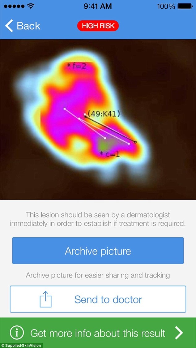 Sau khi phân tích nốt ruồi, ứng dụng sẽ chia sẻ hình ảnh tới bác sĩ của người dùng để cảnh báo nguy cơ mắc bệnh thấp hoặc cao. Ảnh: Dailymail. |