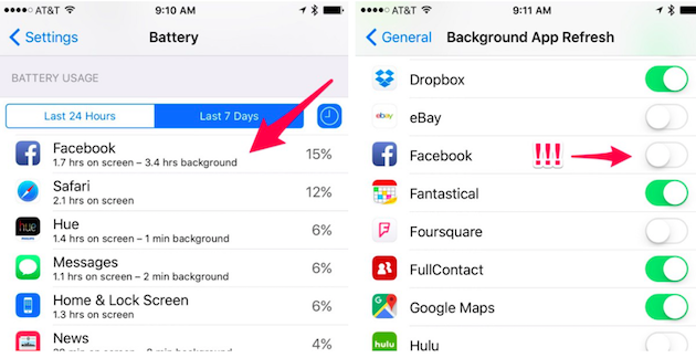 Để đối phó với tình trạng "đốt pin" hiện tại của Facebook, người dùng có thể hạn chế ứng dụng này sử dụng dịch vụ định vị bằng cách chọn "while using app" trong phần "location". Bên cạnh đó, người dùng có thể kết hợp thêm chế độ Low Power Mode có sẵn trên iOS 9 (mục Setting/Battery). Ngoài ra, việc nới khoảng thời gian push mail từ 15 phút lên 30 phút, tắt màn hình động cũng giúp iPhone, iPad tiết kiệm pin hơn.
