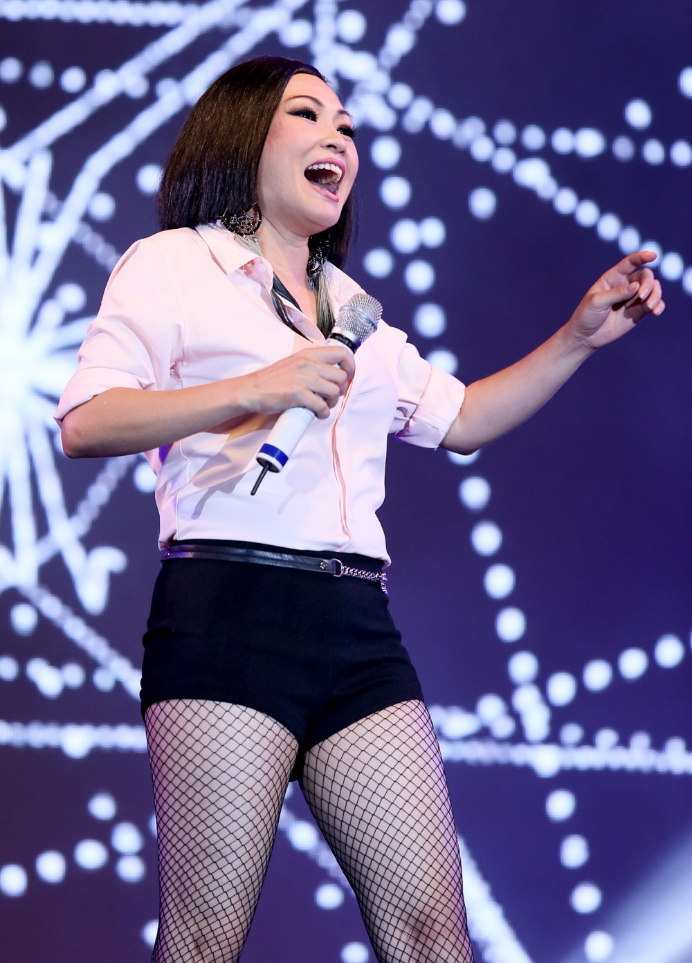 | Cựu người mẫu diện áo crop top, đi dép lào và nhảy nhót thoải mái trên sân khấu. |