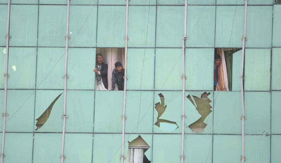 | Cửa kính của tòa nhà cạnh hiện trường vỡ vì xung chấn từ vụ nổ. Vụ tấn công khiến người ta lo ngại về an ninh trong vòng hai của cuộc bầu cử vào tuần tới. |