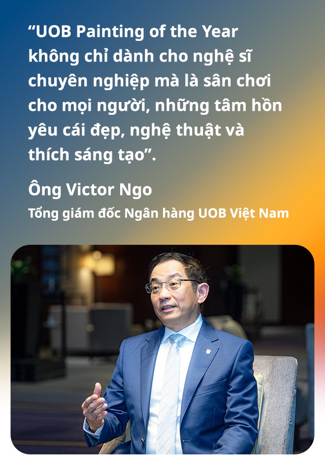 - Trong hơn 40 năm gắn bó và ủng hộ cho nghệ thuật, đặc biệt thông qua cuộc thi “UOB Painting of the Year”, mục tiêu cuối cùng của chúng tôi là mang nghệ thuật thị giác đến gần hơn với công chúng. Cuộc thi “UOB Painting of the Year” không chỉ dành cho nghệ sĩ chuyên nghiệp mà hơn hết là sân chơi cho mọi người, những tâm hồn yêu cái đẹp, nghệ thuật và thích sáng tạo.