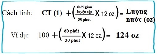 Ví dụ: Theo công thức 1, nếu bạn nặng 50 kg, lượng nước cơ thể cần là 1,5 lít/ngày. Bên cạnh đó, hàng ngày bạn tập thể dục trong 60 phút. Như vậy, bạn cần bổ sung thêm lượng nước sau: 50 oz + [(60/30) x 12 oz] = 74 oz = 2,22 lít.