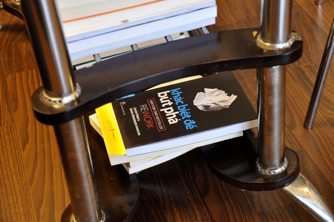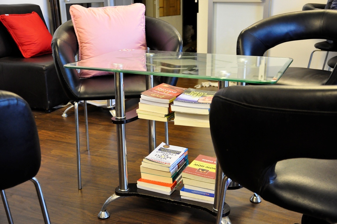 Cách bố trí và bày biện của quán đơn giản như phòng khách của một gia đình thường thường bậc trung với bộ bàn ghế sofa tông màu nhã, gối dựa vuông vức, cây xanh treo dọc bức bình phong. Những chồng sách thuộc mọi thể loại cũng không được bày biện trên kệ mà đặt ngay ngắn dưới chân bàn. Tất cả mang đến cảm giác chỉ ít phút nữa, trong bộ đồ ở nhà, bạn có thể thoải mái ngả lưng trên chiếc ghế êm ái, vừa nhâm nhi món nước yêu thích vừa đọc tiếp cuốn sách còn dang dở.