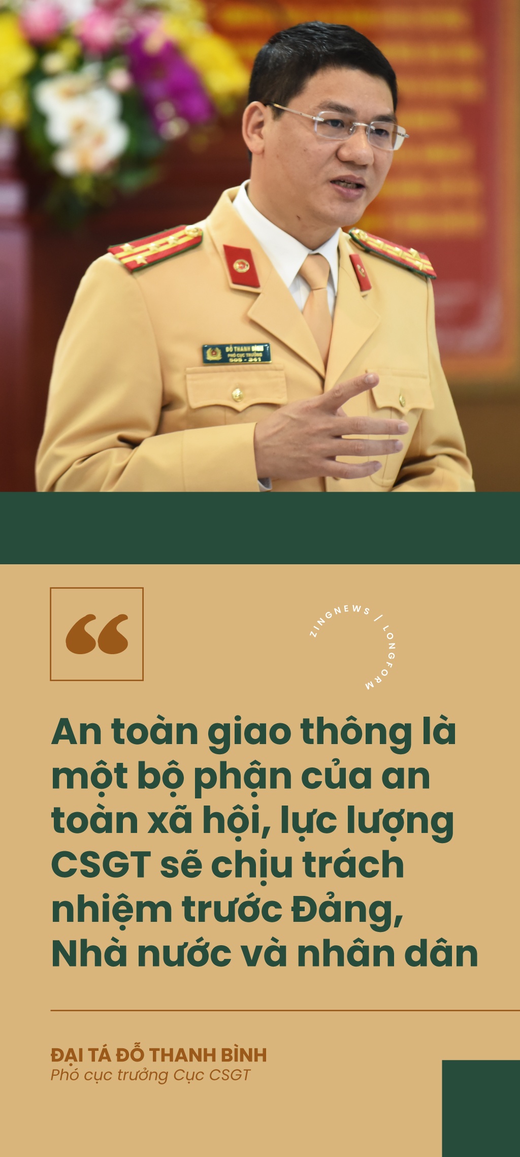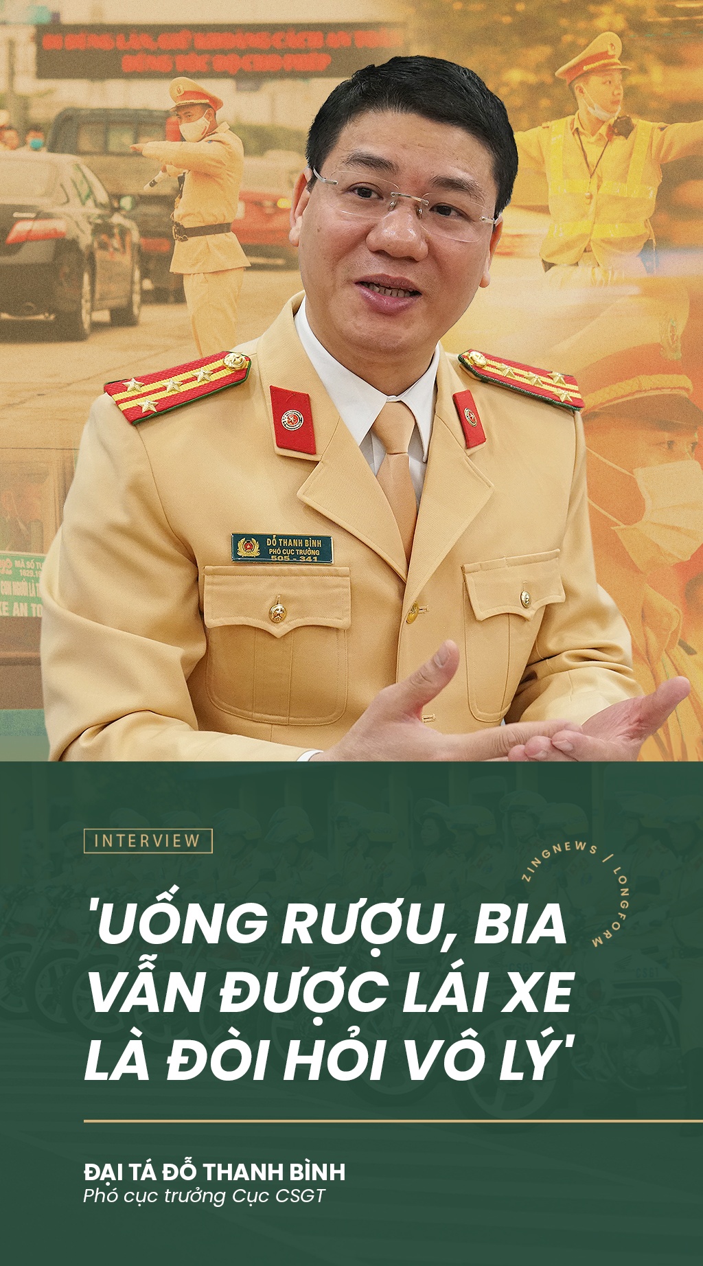 Nhân dịp năm mới 2021 và dịp Nghị định 100 tròn 1 năm có hiệu lực, đại tá Đỗ Thanh Bình, Phó cục trưởng Cục CSGT, đã chia sẻ với Zing về những bước đi của lực lượng áo vàng trong ứng dụng khoa học công nghệ, kéo giảm tai nạn và xây dựng pháp lý để hiện thực mục tiêu biến người dân thành trung tâm.