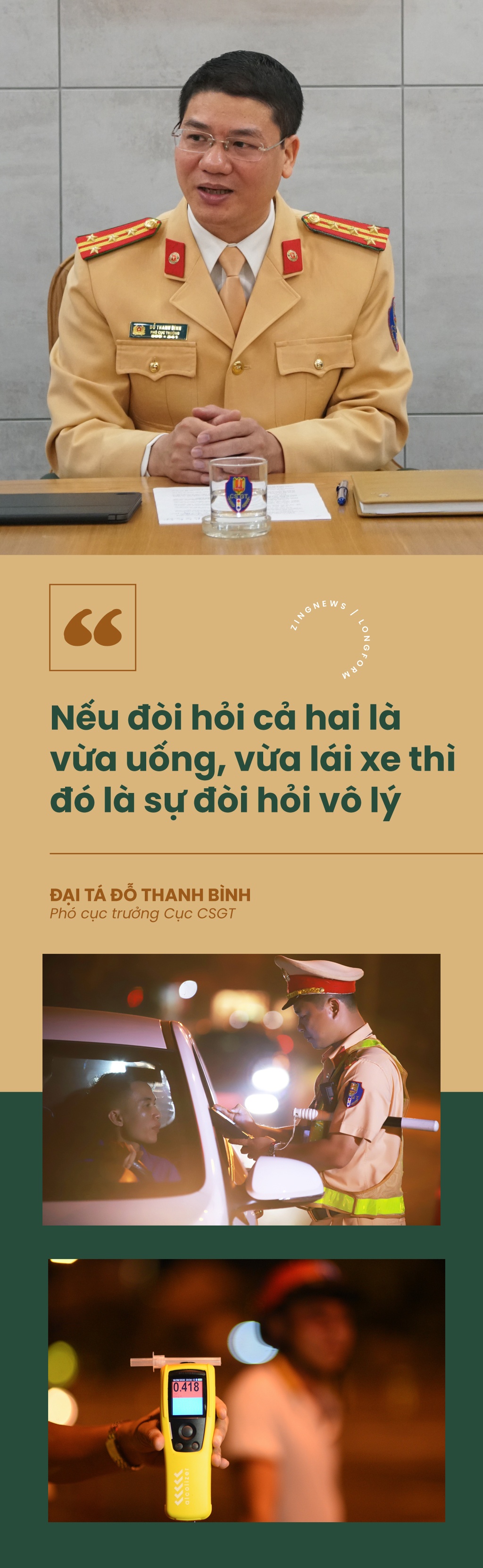 "Nghị định 100 không cấm người dân uống rượu bia, tuy nhiên khi đã uống thì không được điều khiển phương tiện. Nếu muốn cả 2 là vừa uống, vừa lái thì đó là đòi hỏi vô lý", đại tá Đỗ Thanh Bình nói.