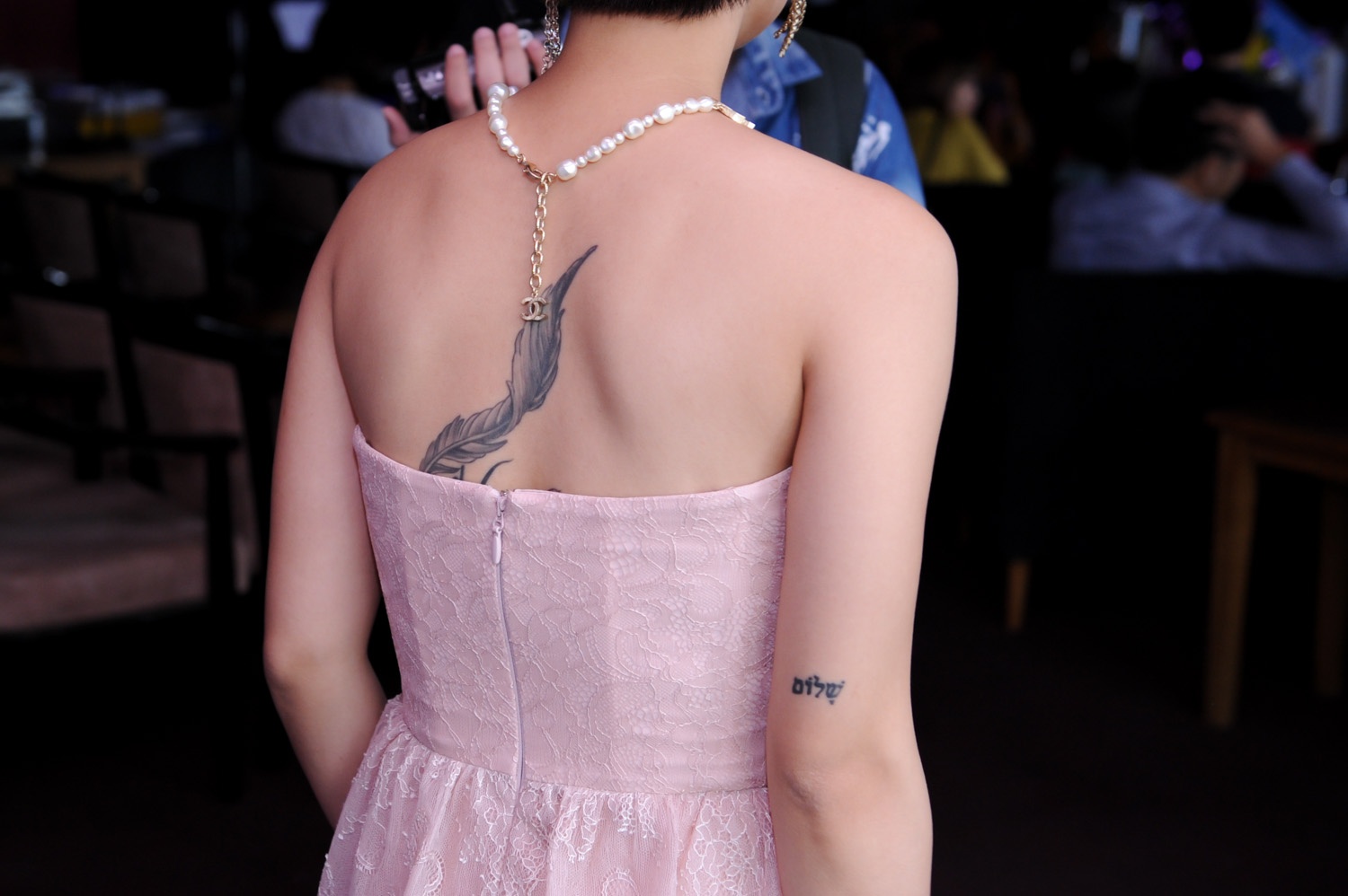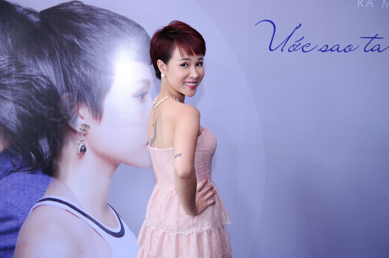 Trong buổi họp báo, nữ ca sĩ diện trang phục gợi cảm khoe những hình xăm độc đáo trên cơ thể.
