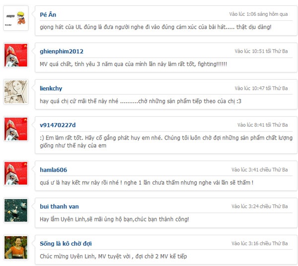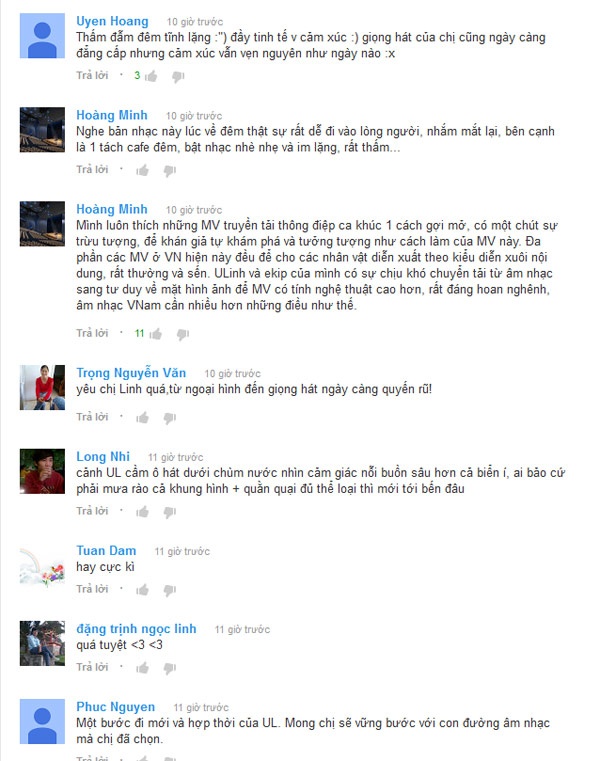 ... và trên Youtube đua nhau dành lời chúc mừng và khen ngợi sản phẩm âm nhạc mới của Uyên Linh. |