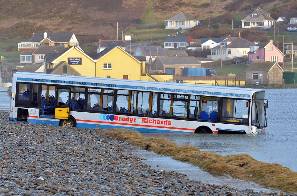 | Xe bus mắc kẹt vì nước lũ tại làng Newgale, hạt Pembrokeshire, xứ Wales. Ảnh: Daily Mail |