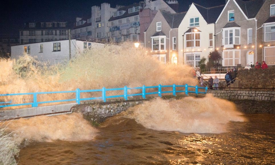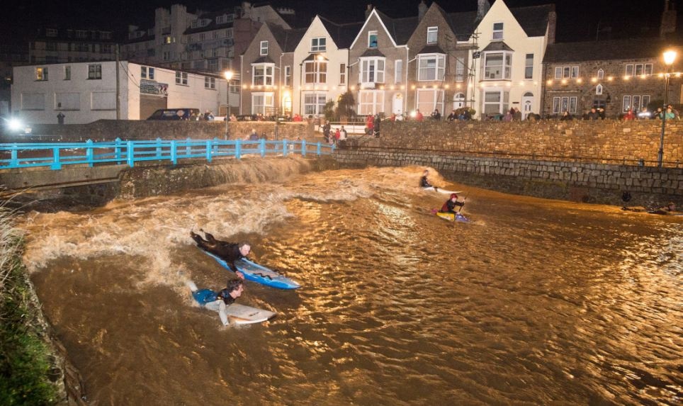 | Nhiều người dân tận dụng lúc sóng dâng cao ở thành phố Bude, hạt Cornwall để lướt ván. Ảnh: Daily Mail |