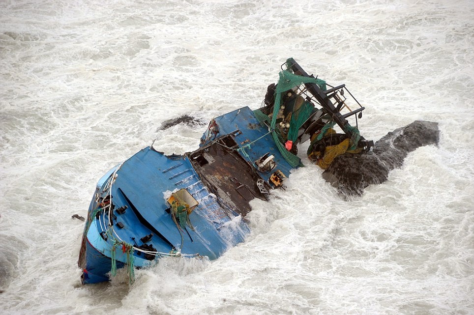 | Một tàu cá chìm trong cơn bão gần thành phố Newquay, hạt Cornwall hôm 1/2. Ảnh: Daily Mail |