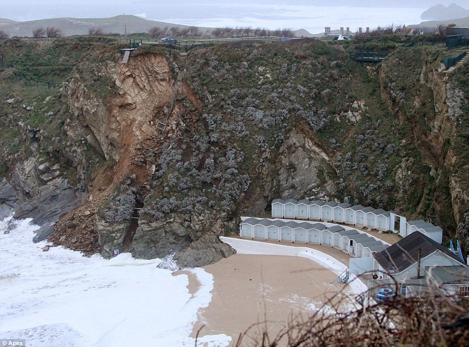 | Những cơn bão và sóng tàn phá một con đường sát bờ biển thuộc thành phố Newquay, hạt Cornwall và để lại một hố lớn. Ảnh: Apex |