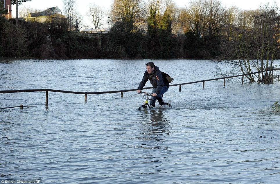 | Nước lũ trên bờ sông Avon không cản trở một thanh niên đạp xe. Ảnh: LNP |
