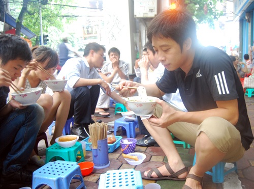 Các quán gánh ven đường là hình ảnh rất quen thuộc với người Hà Nội. Cảnh trai xinh, gái đẹp sành điệu - thậm chí diện đầm duyên dáng - nhưng sẵn sàng ngồi chồm hổm bên vỉa hè bưng bát bún, tô phở xì xụp ngon lành chẳng phải ít.