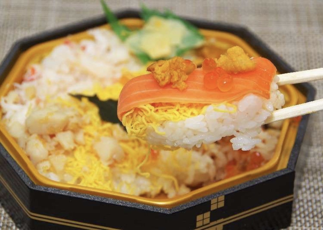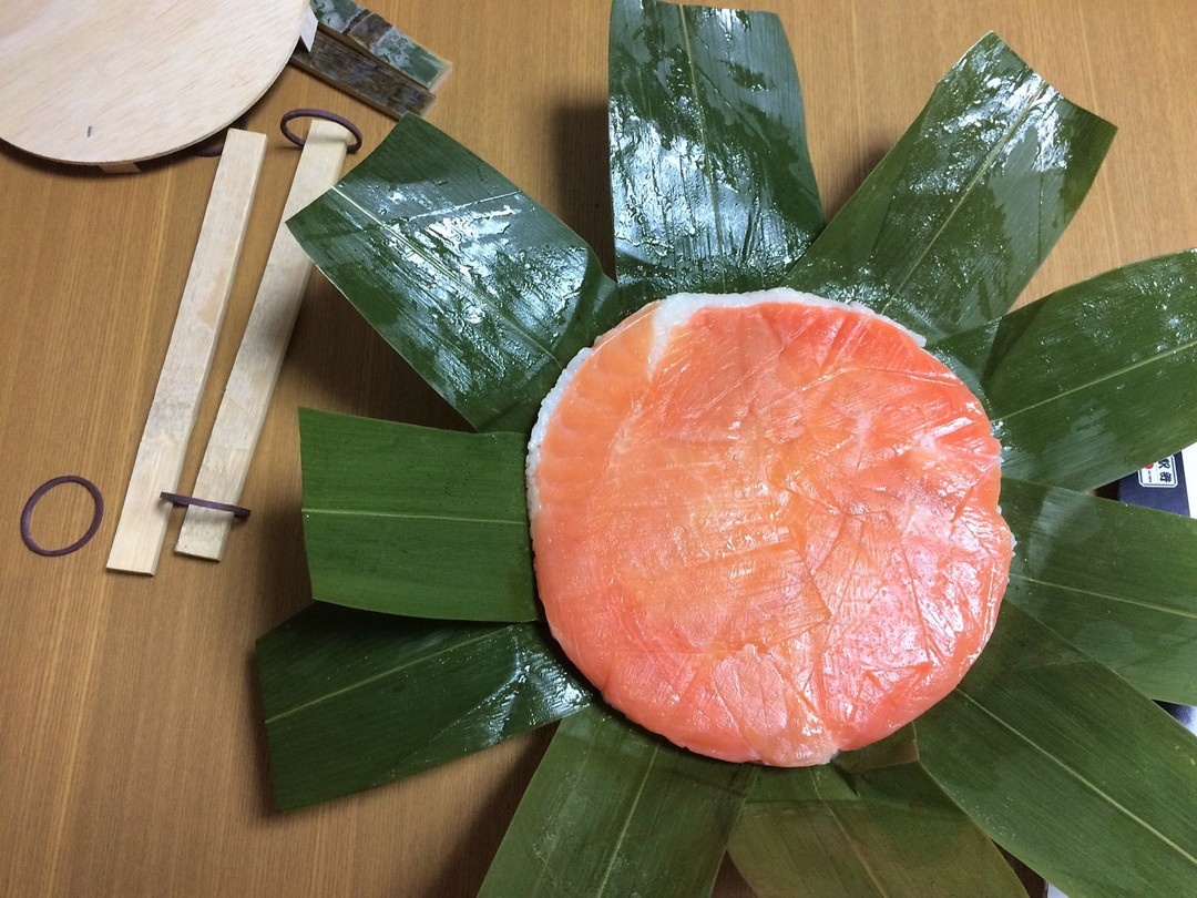 Gắn với tỉnh Toyama, nằm trên đảo Honshu lớn nhất Nhật Bản, masu no sushi là gợi ý hấp dẫn khác dành cho du khách khi muốn thưởng thức ekiben. Phần cơm này thường gói bởi lá tre, đựng trong hộp gỗ thông, phủ bên trên là những dải sashimi cá hồi có màu sắc đẹp mắt. Ảnh: Tabido. |