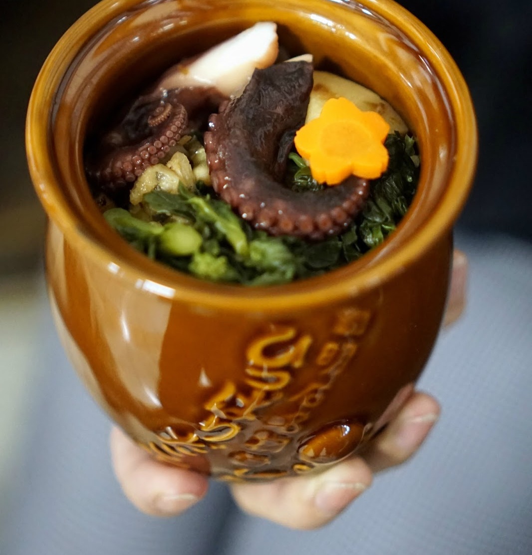 Hipparidako, loại ekiben nổi tiếng của tỉnh Hyogo, nổi bật với hộp đựng là những chiếc hủ (bình) bằng sành, tương tự vật dụng dùng để bắt bạch tuộc ở vùng biển địa phương. Trong món cơm này hẳn nhiên cũng có nguyên liệu bạch tuộc nổi tiếng cùng một số loại măng, nấm... của tỉnh này. Ảnh: Libby-Lin & Koka. |