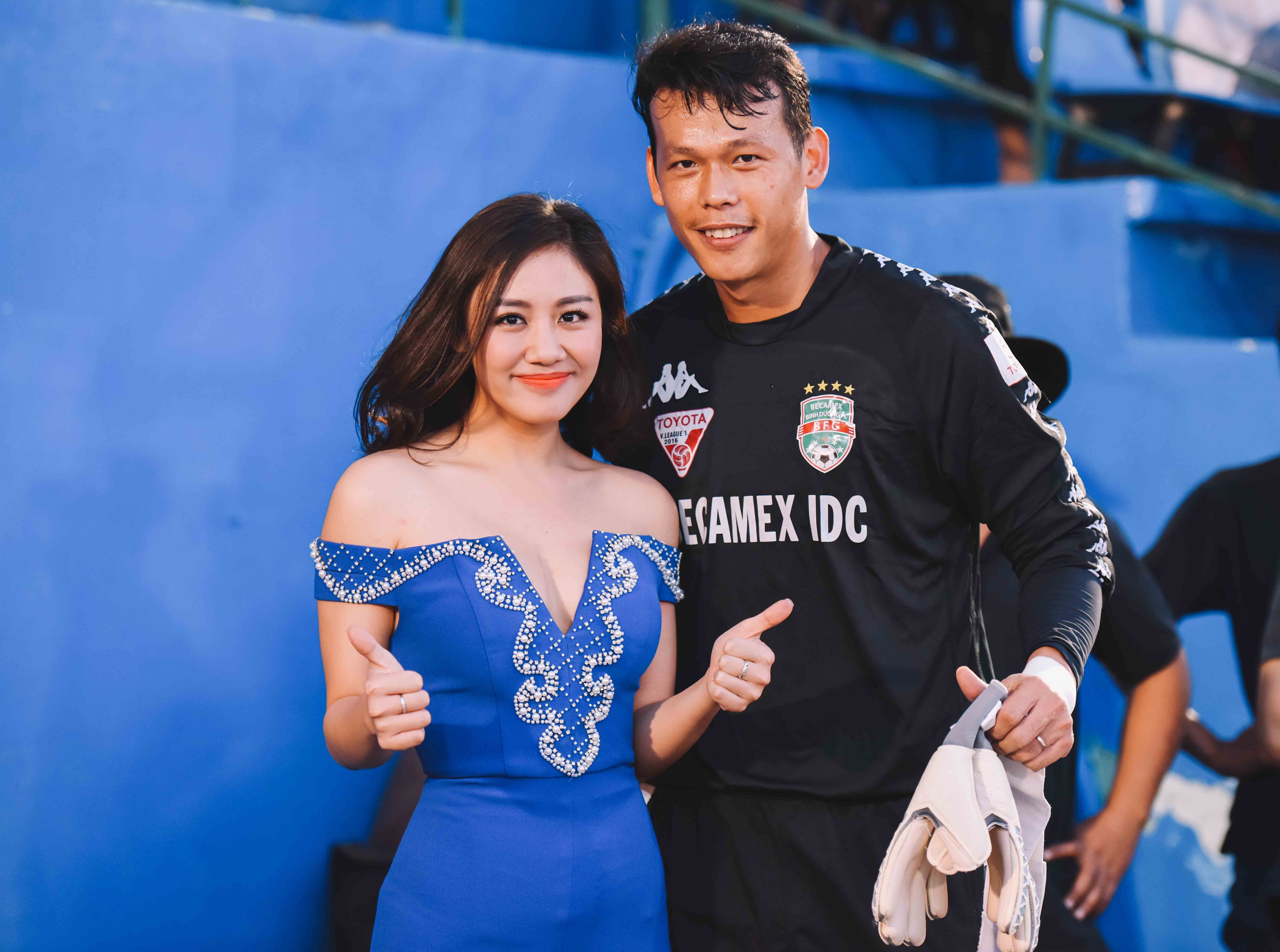 Giọng ca sinh năm 1994 chụp ảnh cùng thủ môn Tấn Trường. |