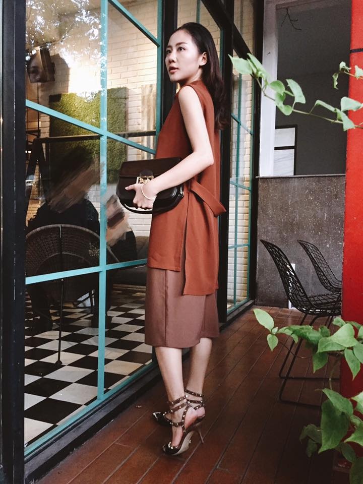 | Đoan Trang tự tin dạo phố với bộ cánh ôm dáng, tông màu nâu. Phụ kiện túi xách gam vàng bắt mắt làm điểm nhấn phong cách. |