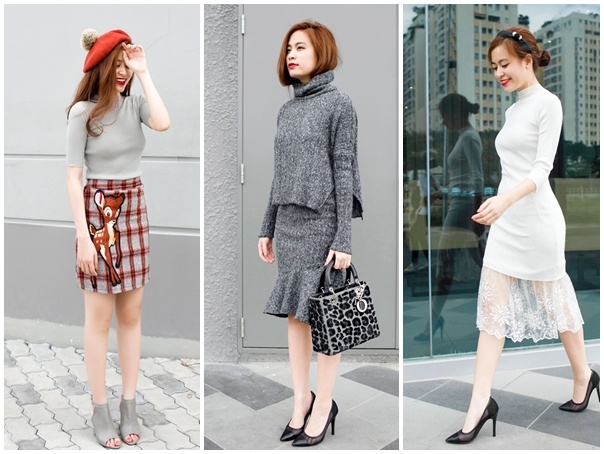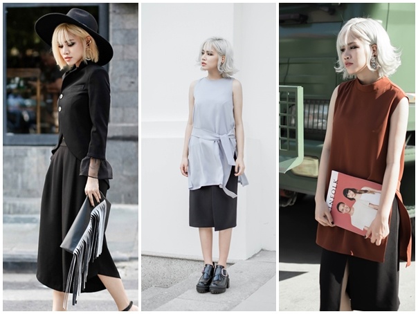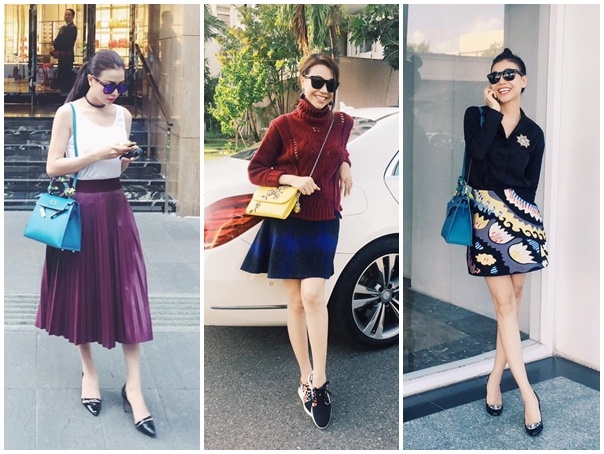 | Trà Ngọc Hằng thay đổi hình tượng với những set đồ thu đông nữ tính. Chân váy xếp ly, áo thun, chân váy họa tiết, giày khoét lòng, bata,... là những items được nữ người mẫu cưng chiều. |