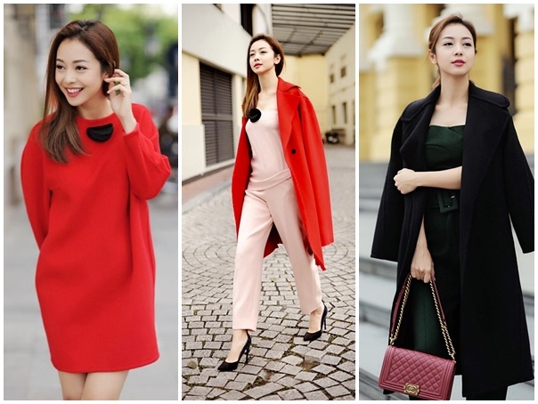 | Xuống phố thu đông tại Hà Nội, Jennifer Phạm chọn trang phục chất liệu dạ giữ ấm. Tông màu đen đỏ và hồng nhạt phù hợp nước da trắng hồng của bà mẹ hai con. |