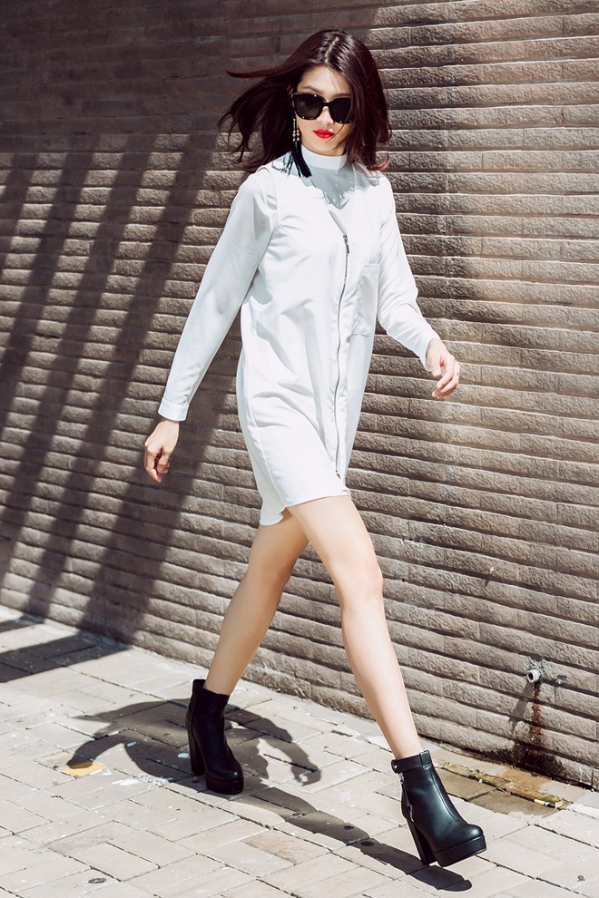 | Chế Nguyễn Quỳnh Châu chọn phong cách hiện đại và không kém phần cổ điển với sơ-mi trắng "giấu quần" đi cùng boots cổ ngắn sành điệu. |
