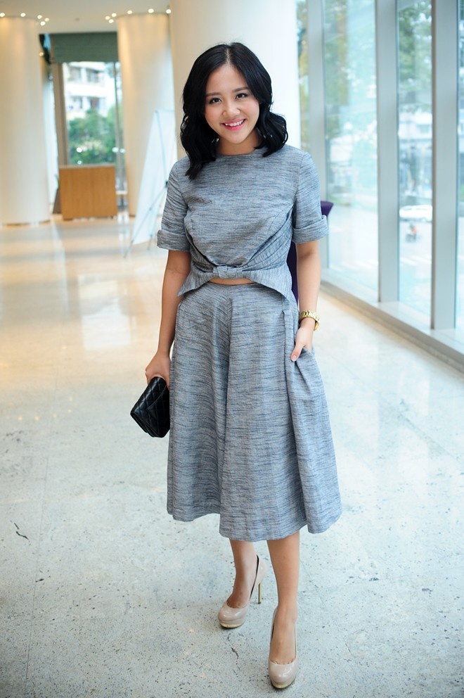 | Kiểu đầm kết hợp giữa váy midi và crop top kết hợp với nút xoắn là điểm nhấn giúp cô ghi điểm. |