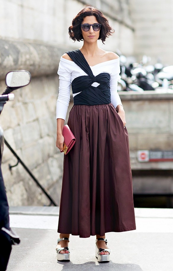 | Cô nàng cá tính trên phố với áo thun, váy midi thắt nút rất hấp dẫn. |