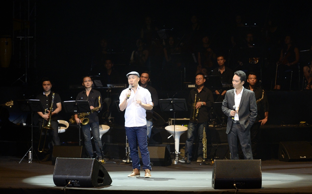 | Cặp MC Anh Quân - Huy Tuấn khiến khán giả khá bất ngờ và thích thú với những chia sẻ về ước mơ của nghệ sĩ Việt Nam muốn được đứng chung sân khấu với các nghệ sĩ đẳng cấp quốc tế như Peabo Bryson. |