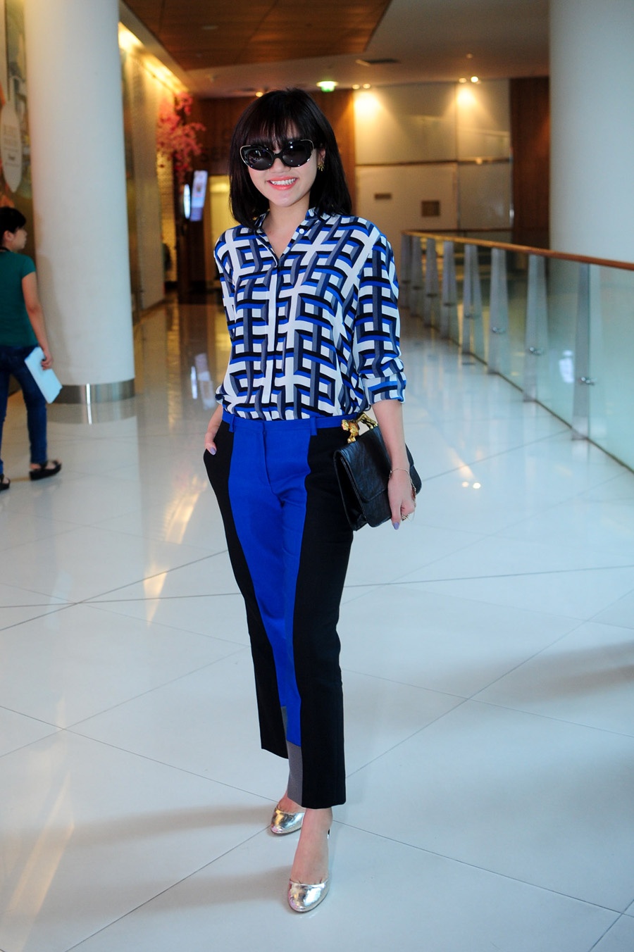 | Cô diện trang phục khá chất kết hợp với kính mắt mèo cá tính khi xuất hiện bên cạnh người đàn anh. |