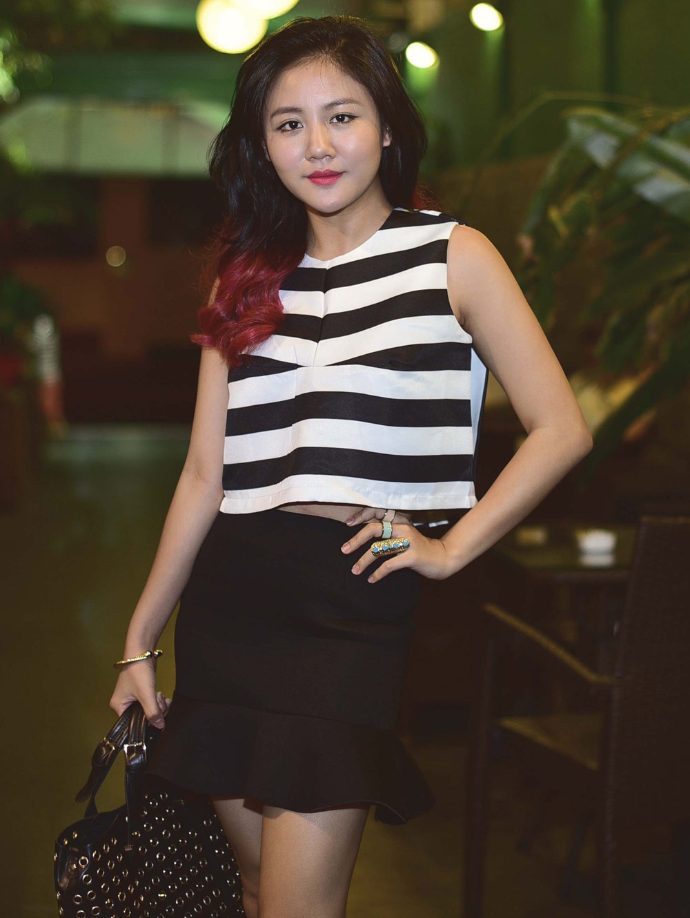 | Nữ ca sĩ Hà thành ăn mặc trẻ trung, tinh tế trên sân khấu. Mái tóc hai màu đen và đỏ của cô thu hút sự chú ý của khán giả. |