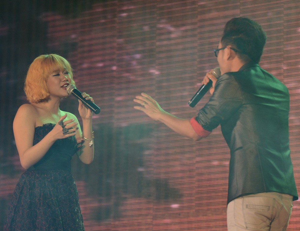 Tối qua, cô cũng trình diễn ca khúc My Valentine và vũ công Quang Đăng bất ngờ xuất hiện với đóa hồng đỏ rực trên tay để dành tặng nữ ca sĩ Chậm lại một phút.