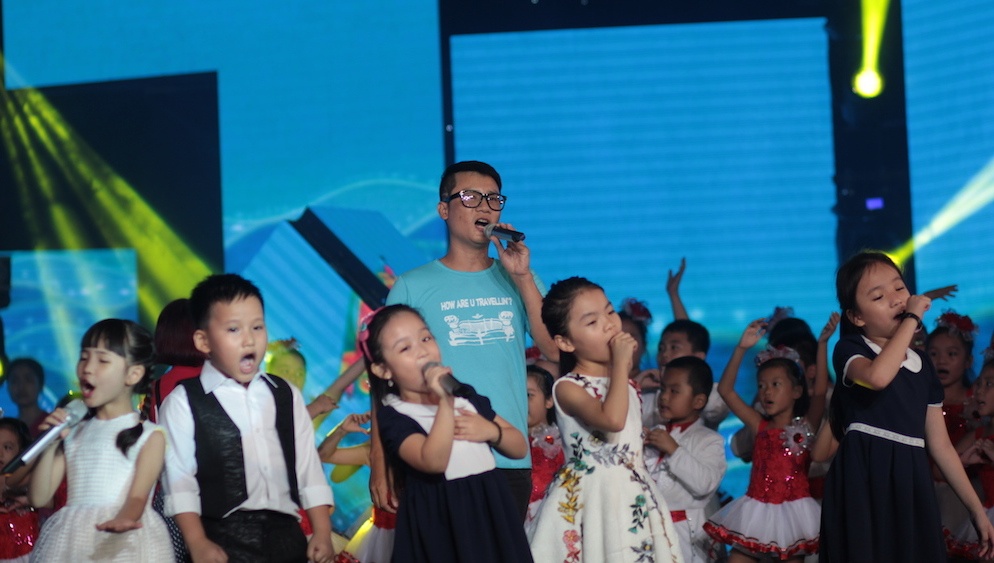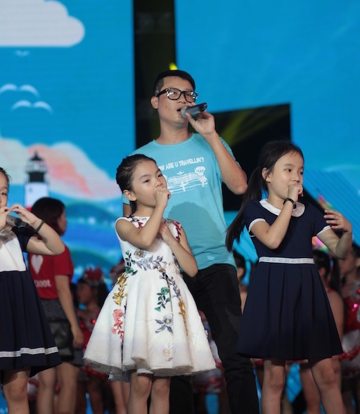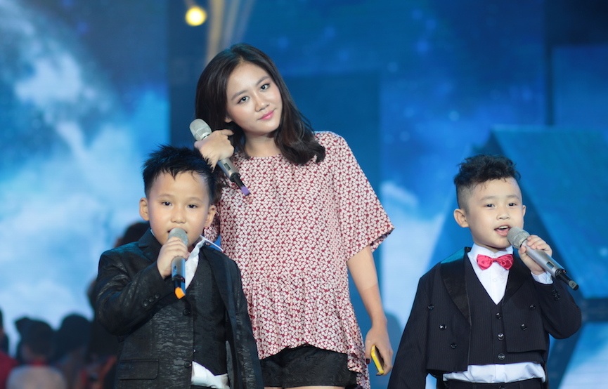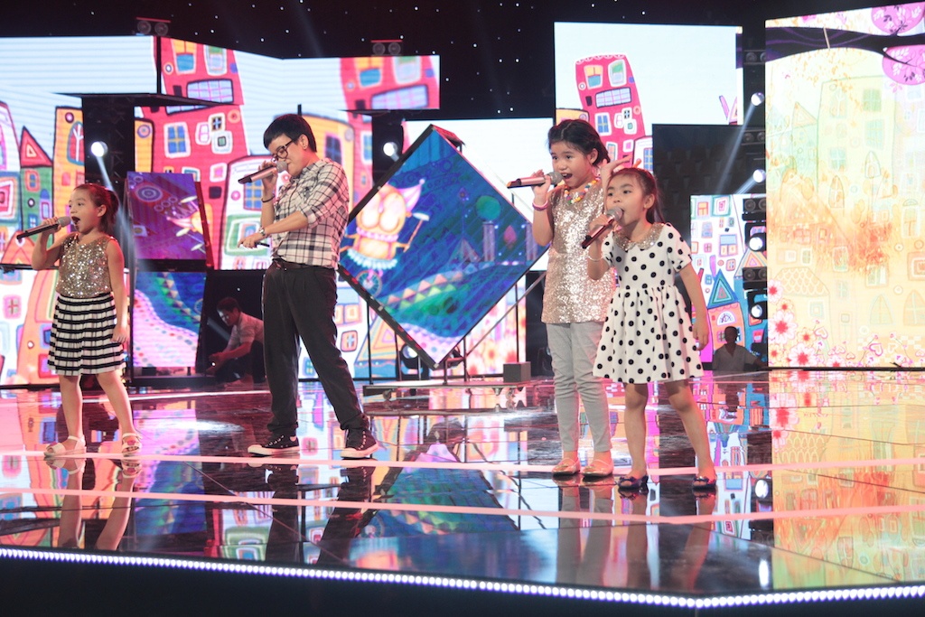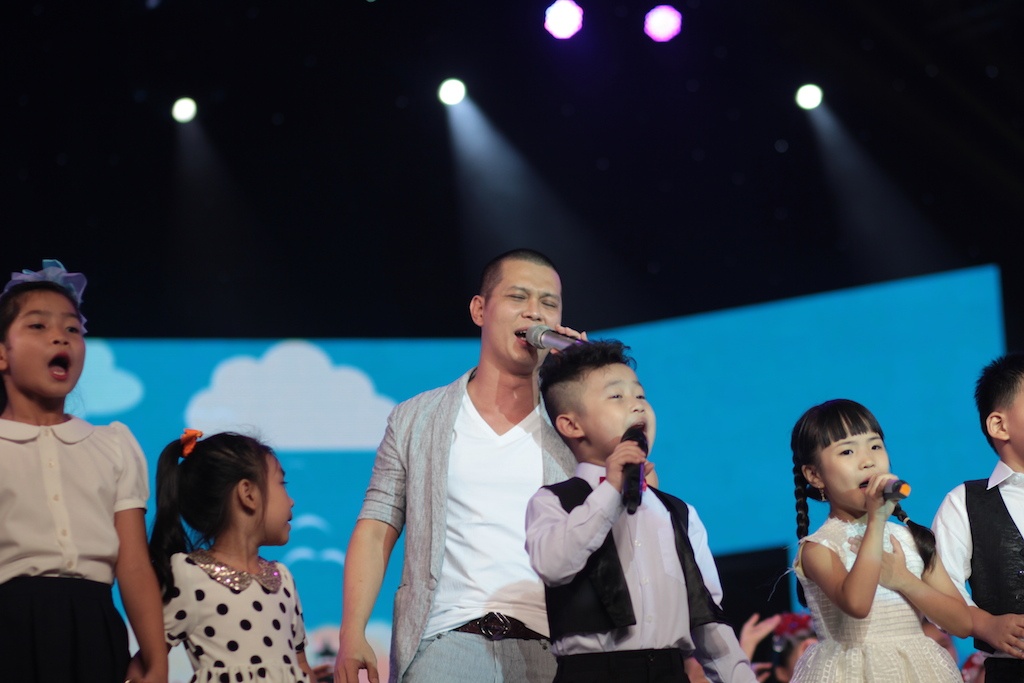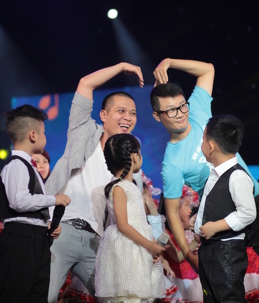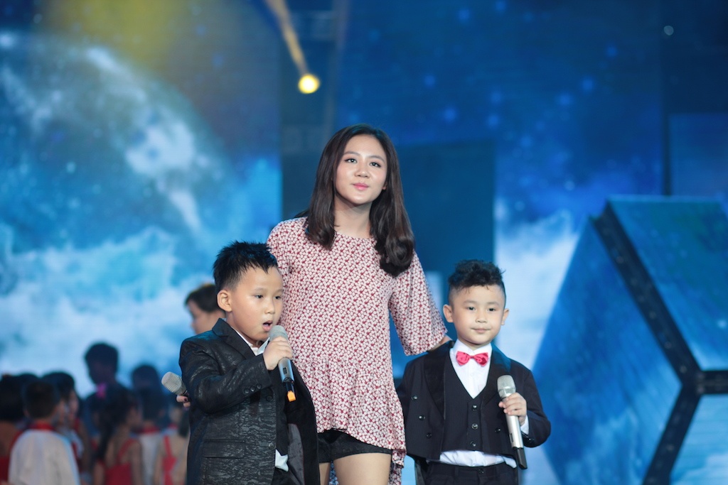| Ngoài hai giám khảo Phương Uyên và Văn Mai Hương, các ca sĩ khách mời như Nam Khánh, Hoàng Bách cũng có mặt trong buổi tập cuối trước giờ G với các bé. |