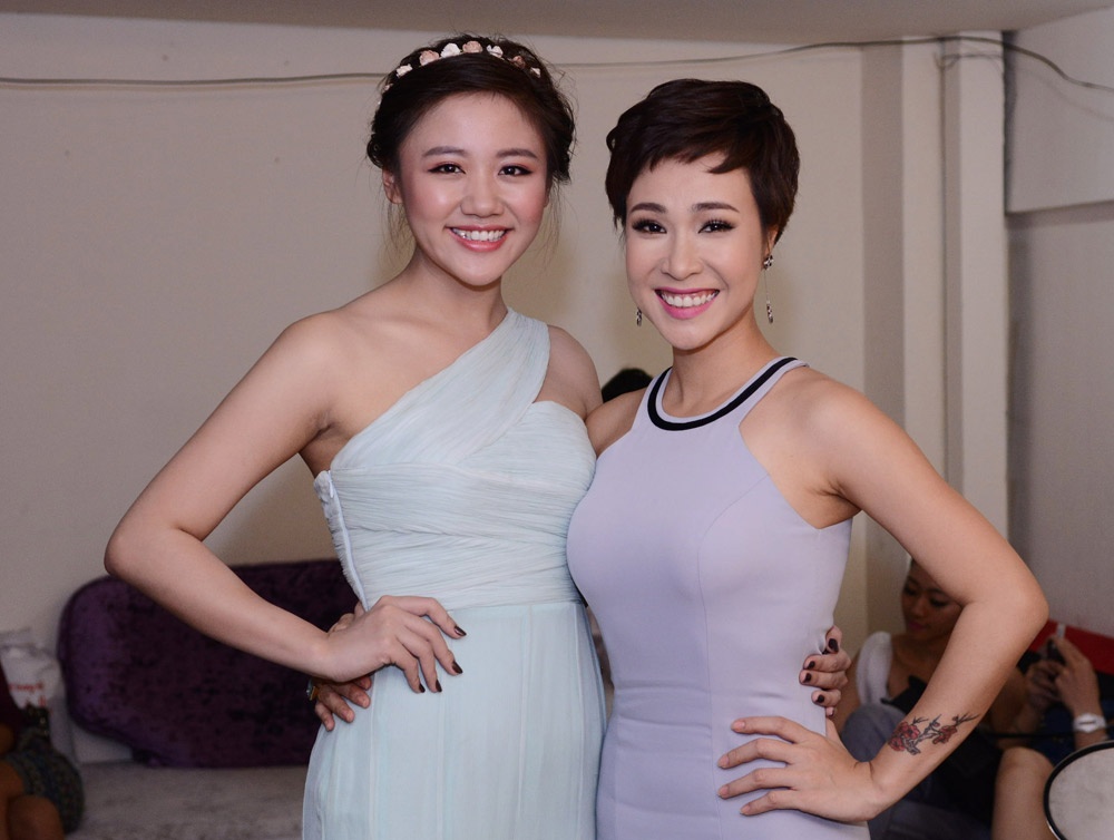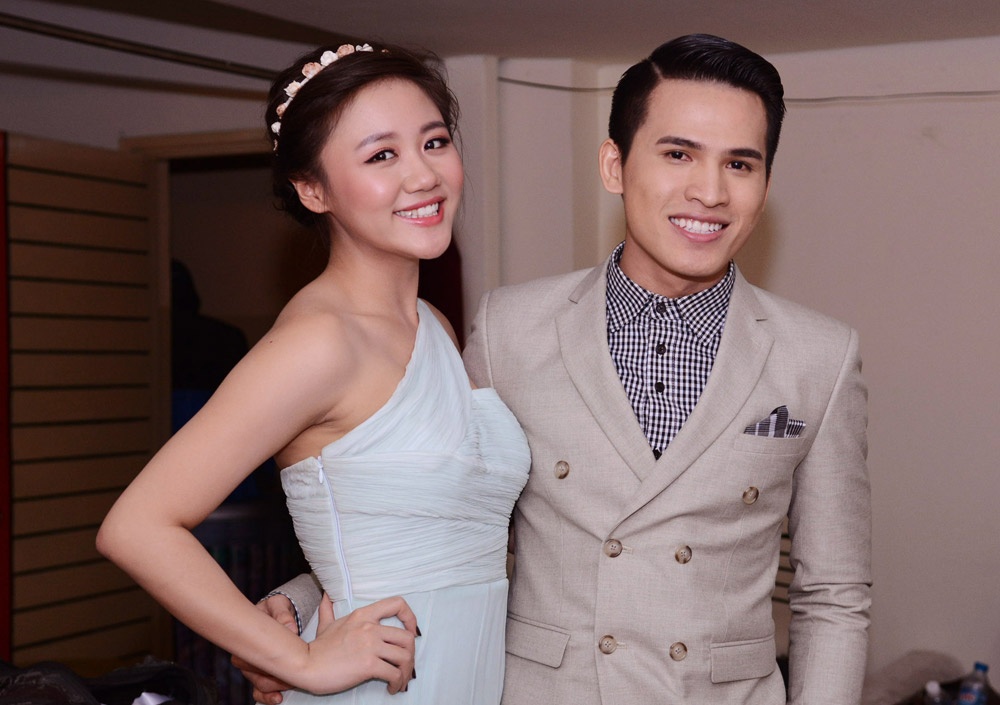 | Văn Mai Hương chụp cùng Quốc Thiên trong hậu trường liveshow. Nữ ca sĩ khoe vừa thực hiện phần hình ảnh MV Là em đó cùng với sự xuất hiện của quán quân So you think you can dance 2013 Ngọc Thịnh. Cô hóa thân thành nữ sinh quyến rũ trong một tiệm sách và hòa điệu cuồng say cùng các vũ công trong một bối cảnh hết sức ấn tượng tại quận 2, TP.HCM. |