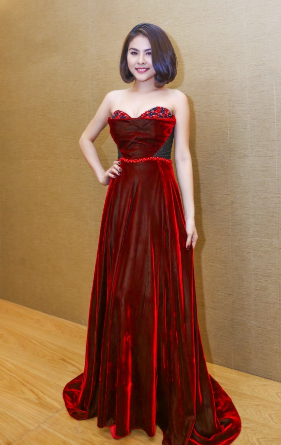 | Thiết kế đầm nhung đỏ với cắt cúp quyến rũ giúp Vân Trang khoe khéo vẻ gợi cảm. |