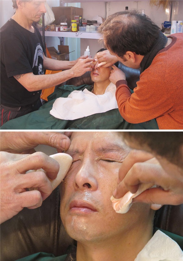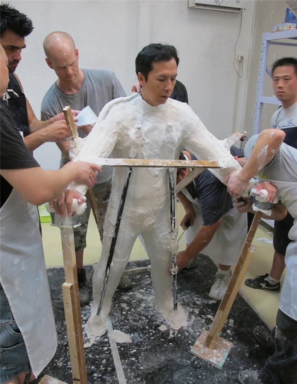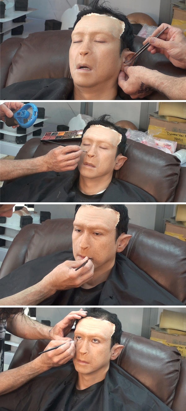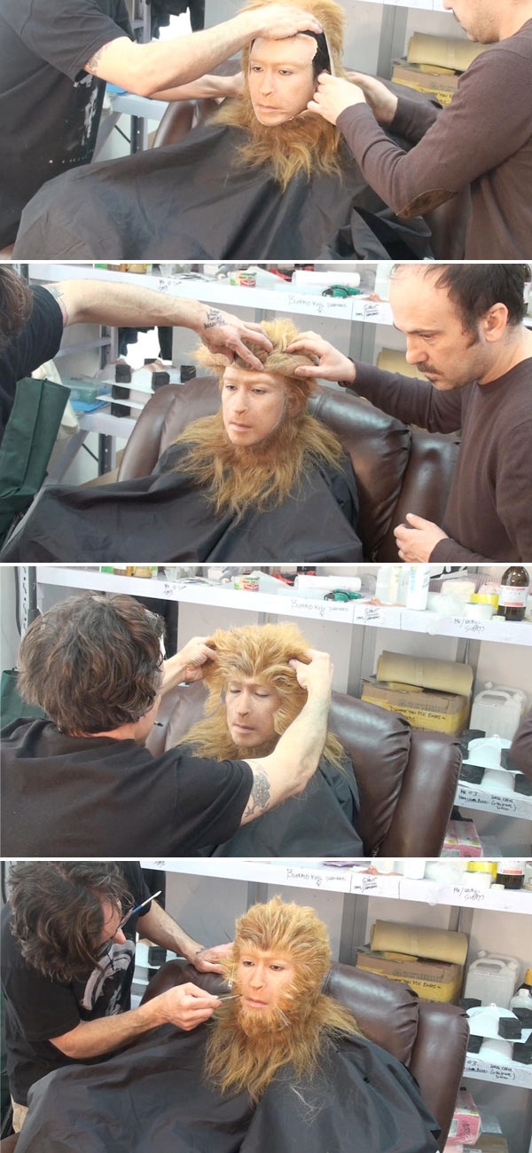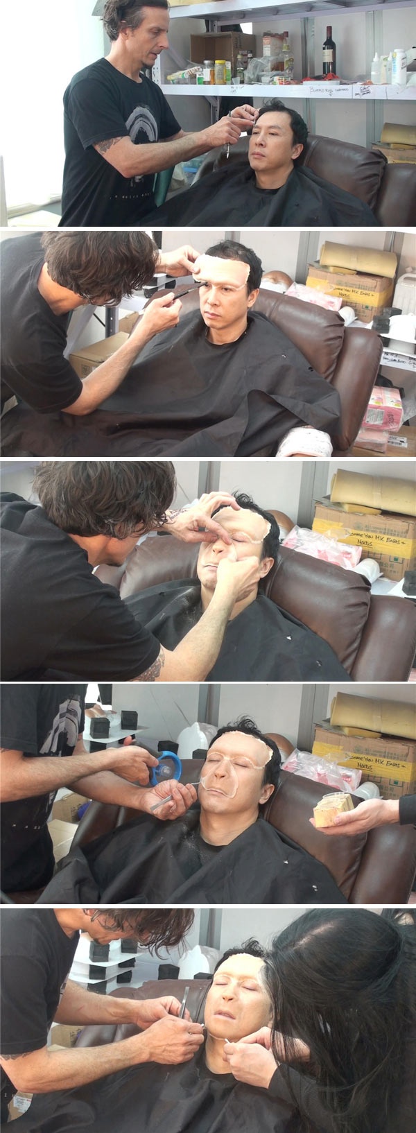 | Bắt đầu nằm trên ghế để thực hiện công đoạn hóa trang. Các chuyên gia dán lên mặt Chung Tử Đơn một lớp da nhân tạo đã được đúc theo khuôn mặt anh. |