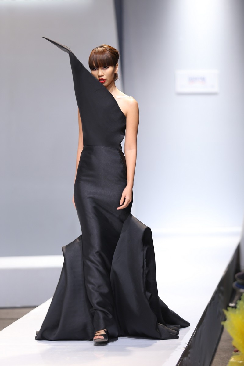 | Thiết kế độc đáo với phần thân áo tạo kiểu táo bạo. Mẫu thiết kế có gam màu đen sang trọng, phù hợp với hình ảnh của Hà Anh. |