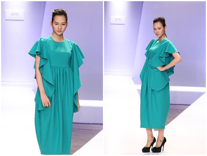 | Một trong những thiết kế nhận được đánh giá thấp do lạm dụng nhiều chi tiết bèo nhún tại tay áo và xếp ly tại vòng eo tạo nên tổng thể rối mắt khiến người mặc như bị tăng cân. |