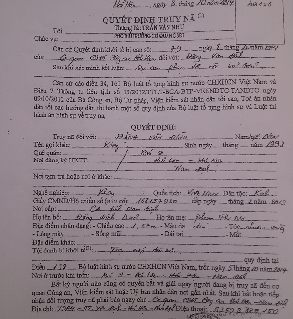 | Quyết định truy nã của công an Hải Hậu đối với Đình. |
