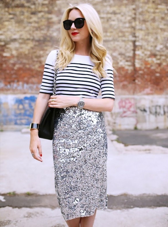 | Một gợi ý thanh lịch với sơ mi kẻ và sequin đen lấp lánh, sang trọng. |