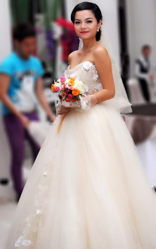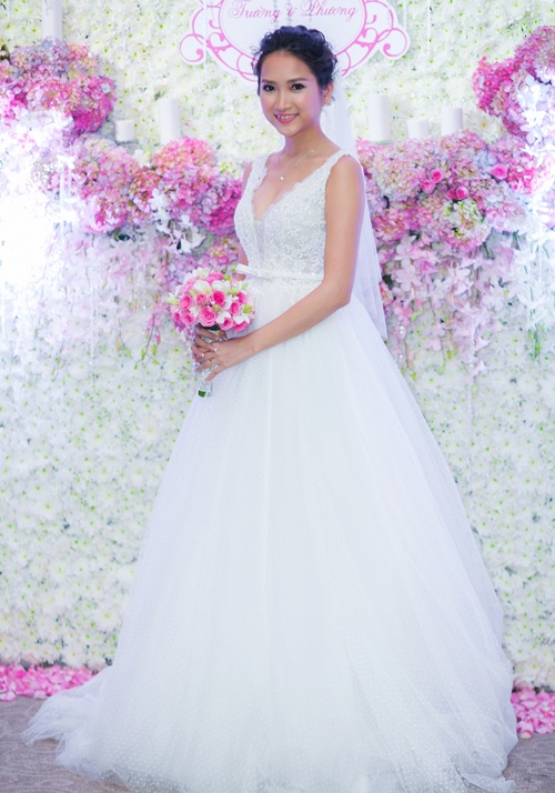MC Quỳnh Chi: Đám cưới của hotgirl Quỳnh Chi và con trai nữ đại gia Diệu Hiền thu hút sự quan tâm của đông đảo giới kinh doanh và giải trí năm 2012. Cô dâu sinh năm 1990 chọn một chiếc váy cưới có phong cách đài các và lãng mạn. Toàn bộ váy cưới không sử dụng chất liệu ren thông thường mà được bao phủ hoàn toàn bằng voan mỏng. Thiết kế phần ngực là kiểu váy quây quen thuộc, điểm nhấn kết hoa lệch một bên ngực góp phần thu hút cho thiết kế váy đơn giản. Màu pastel là một lựa chọn thông minh của cô dâu bởi đây là tông màu tôn da, làm nổi bật nước da trắng ngần của Quỳnh Chi. Đây cũng là mẫu váy cưới được Quỳnh Chi chọn lựa từ một NTK trong nước.