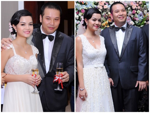 Ca sĩ Phạm Quỳnh Anh: Cô dâu Phạm Quỳnh Anh chọn 4 chiếc váy cho ngày trọng đại của mình. Áo dài ren trắng diện vào buổi sáng, váy cưới đơn giản ôm sát được chọn khi đón khách. Thiết kế quây có đường cắt tinh xảo và đính hạt công phu dành cho phần nghi lễ và thiết đãi khách. Đi kèm với 4 y phục là tông màu make-up hồng nhạt vào buổi sáng, tông nâu đỏ nổi bật được dùng cho phần tiệc đêm.