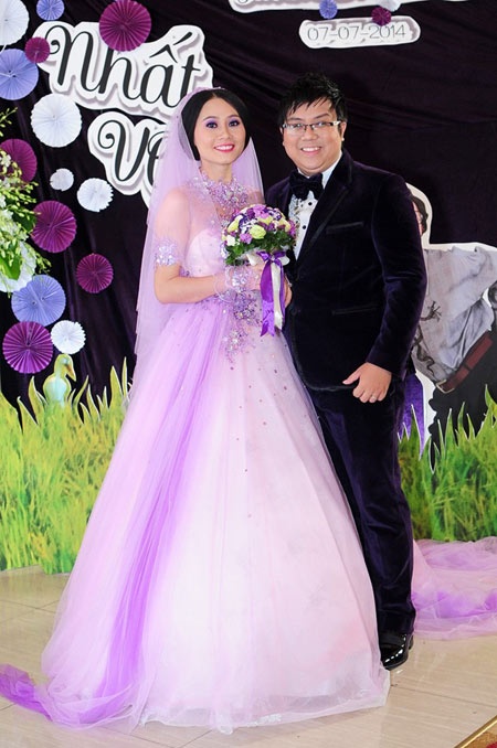 | Vợ Gia Bảo: Đám cưới của diễn viên hài Gia Bảo và vợ Thanh Hiền diễn ra vào ngày 7/7. Trong đám cưới, cô dâu khoe nét duyên nữ tính trong chiếc váy cưới màu tím lãng mạn. Kiểu dáng váy xòe truyền thống, đơn giản nhưng điểm nhấn lại nằm ở màu sắc và các chi tiết đính trên thân áo. Điểm nhấn thân áo ren đính hạt tím hợp tông và làm nổi bật nét sang trọng. Xen kẽ giữa lớp voan tím pastel là dải voan hồng tím ở chân váy. Trang phục được NTK Minh Châu thực hiện với giá thành phải chăng. Tuy nhiên, không lâu sau đó, NTK Anh Thư lên tiếng tố cáo vợ chồng nam diễn viên đạo váy cưới. |
