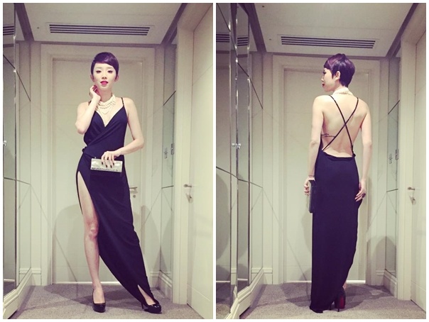 | Một trong những bộ cánh dạ hội dây mảnh của Tóc Tiên được các tín đồ thời trang khen ngợi. Thiết kế tông đen, xẻ cao, dây mảnh hở trọn tấm lưng trần giúp giọng ca Ngày mai nổi bật tại sự kiện tháng 3. |