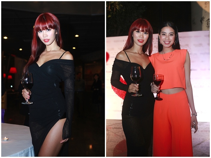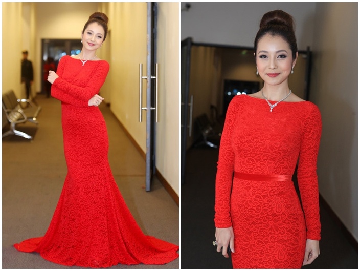 Cũng trong đêm diễn ra liveshow của Bằng Kiều, Hoa hậu châu Á tại Mỹ khoe dáng chuẩn với đầm ôm sát. Mẫu váy chất liệu ren được thiết kế kín đáo phù hợp với thời tiết lắc rắc mưa phùn tại Thủ đô. Tông màu đỏ tôn vinh nhan sắc đằm thắm của bà mẹ hai con.