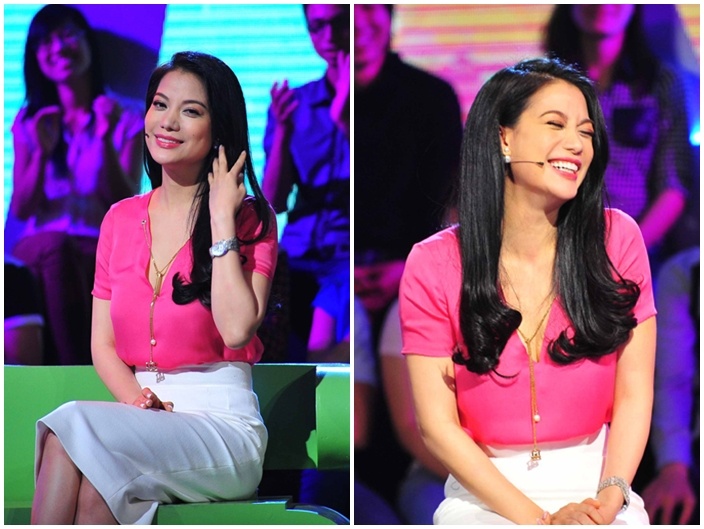 Trương Ngọc Ánh phát huy hiệu quả gu thời trang thanh lịch. Không chỉ mặc đẹp khi tham dự sự kiện, bà xã của doanh nhân Trần Bảo Sơn còn rất duyên dáng, chừng mực khi góp mặt tại một chương trình talkshow diễn ra trong tuần. Nữ diễn viên thu hút ánh nhìn với cách phối hài hòa giữa chân váy bút chì gam trắng và áo gam hồng ngọt ngào, điểm nhấn là vòng cổ dáng chữ V sâu. Phụ kiện tinh tế góp phần giúp hình ảnh người mặc thêm sinh động.