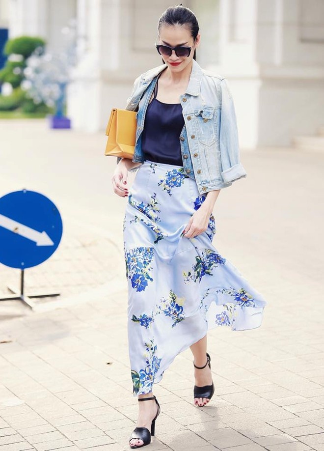 | Thanh Trúc kết hợp khéo léo váy maxi với áo denim jacket cùng màu đẹp mắt. |