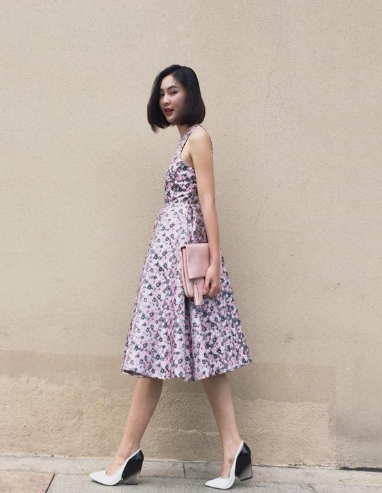 | Năm nay, bên cạnh các xu hướng hoa lá với màu sắc tươi tắn, những tông màu sậm cũng hết sức được ưu ái vì nó giúp tôn cá tính cho người mặc. Trong ảnh, Trà Ngọc Hằng có cách mix đồ rất thú vị của đầm hoa với phụ kiện tông trầm. |